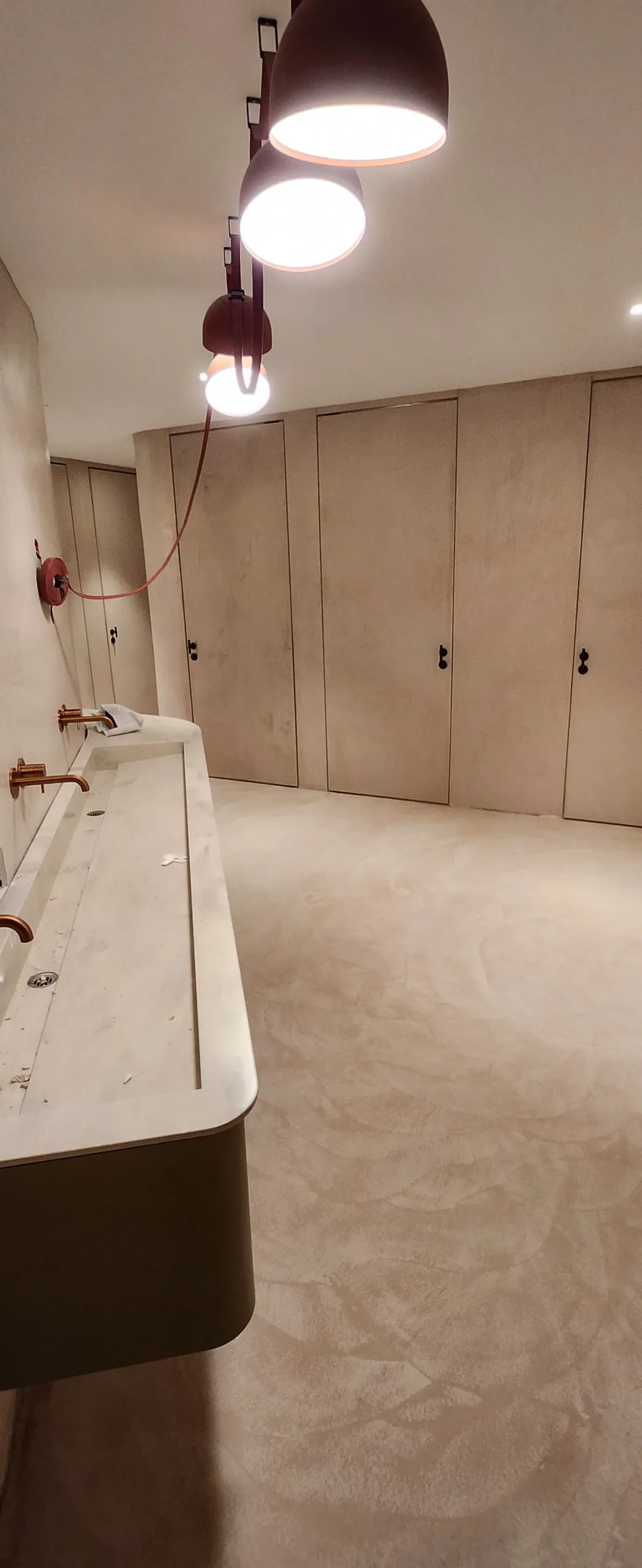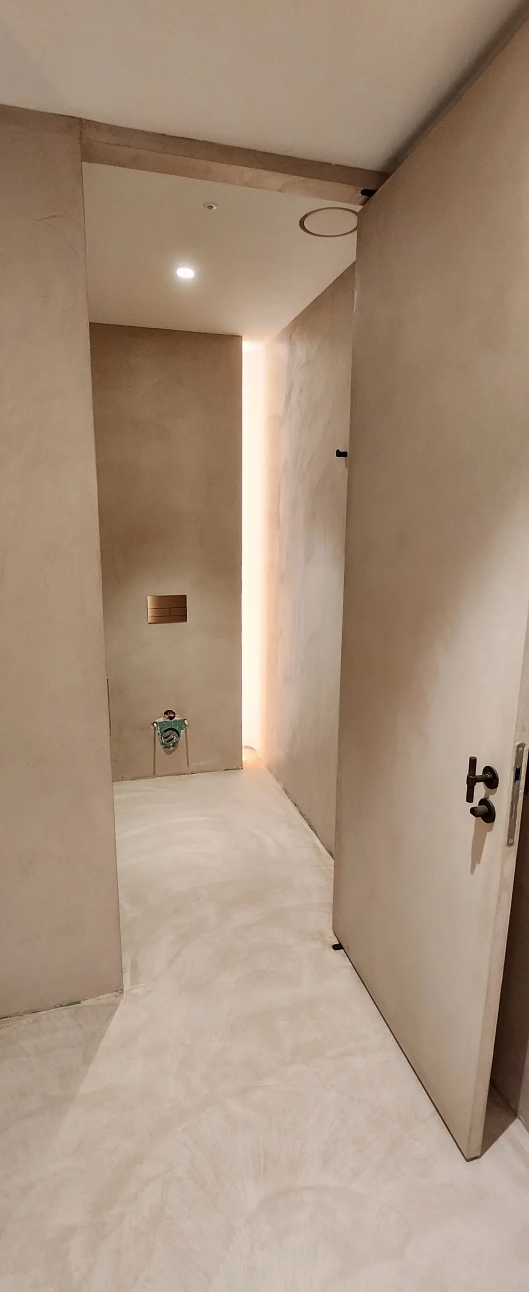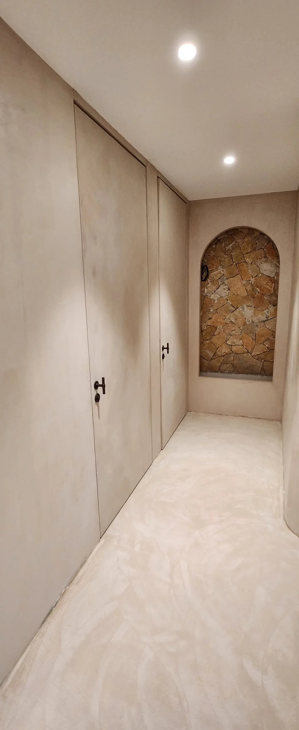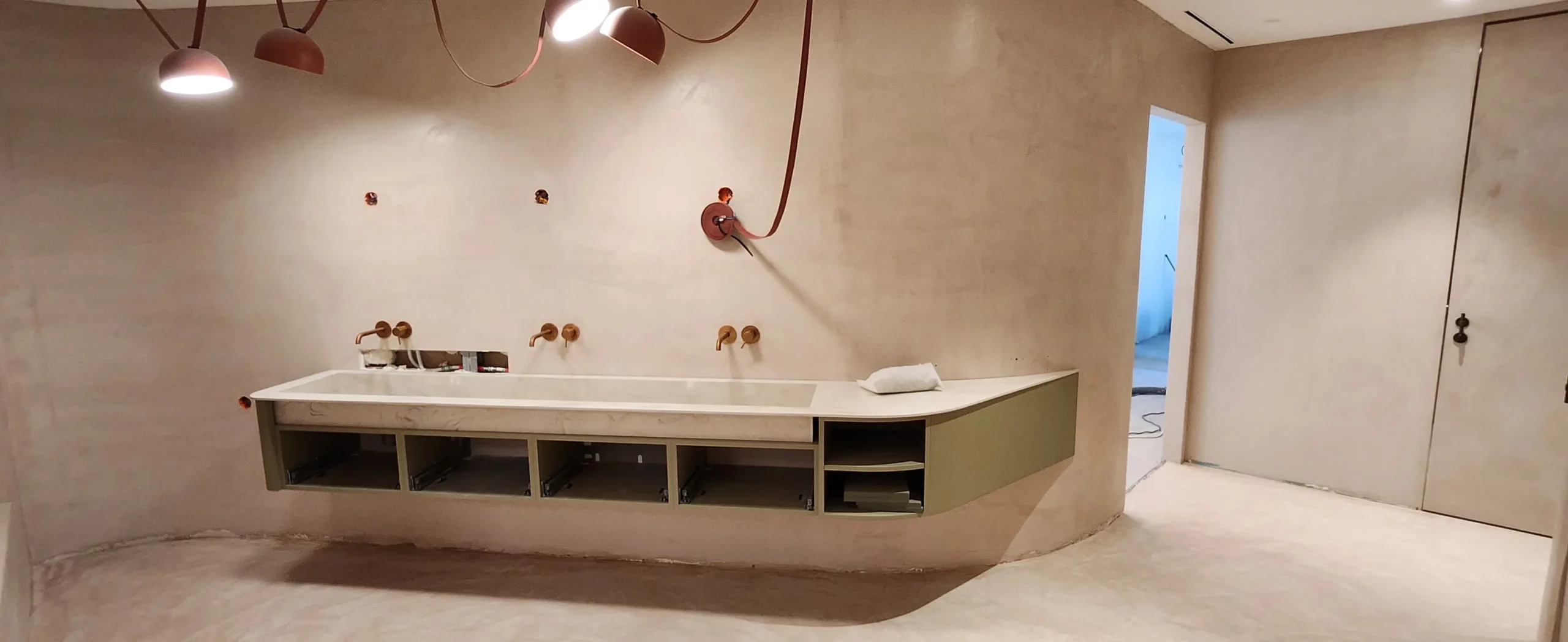 Aménagement intérieur en béton ciré, ambiance contemporaine et chaleureuse.