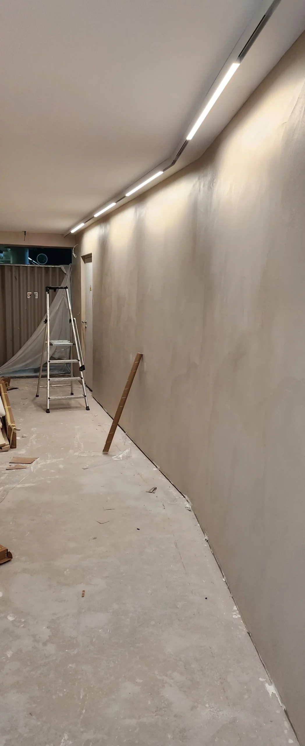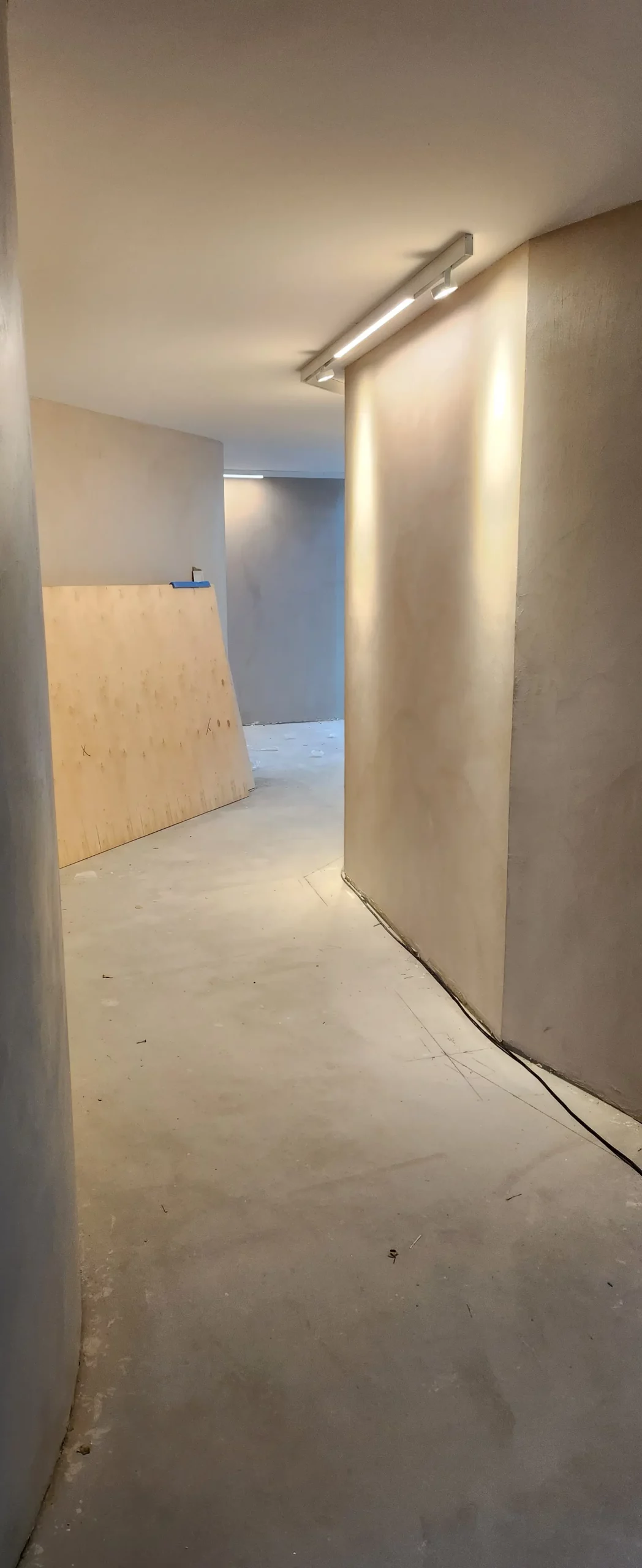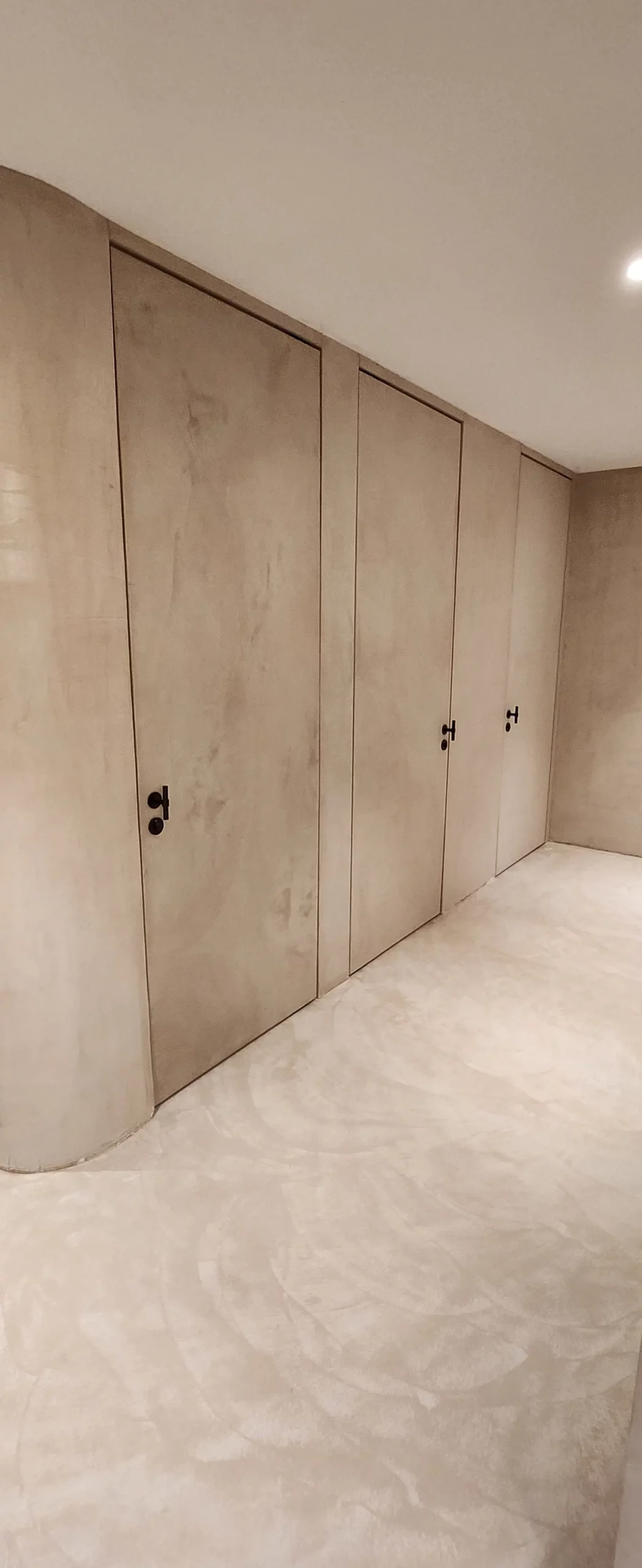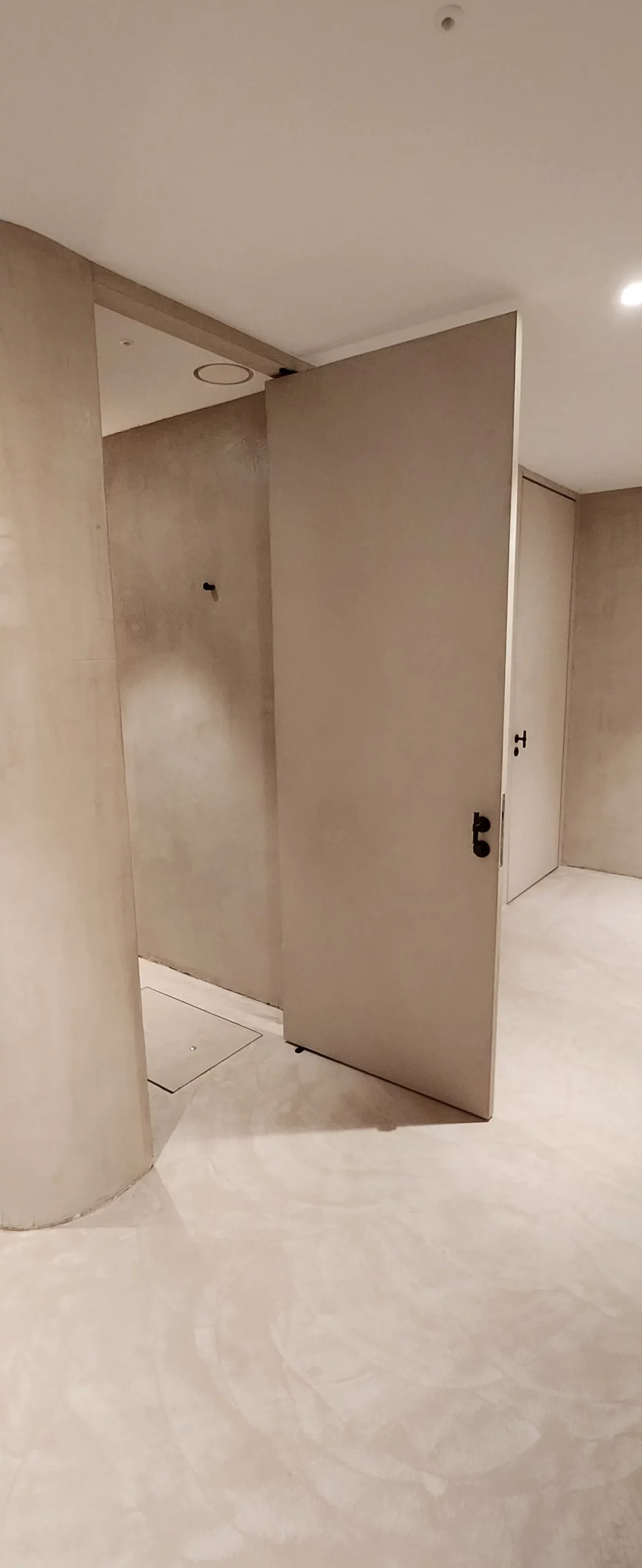Aménagement intérieur en béton ciré, ambiance contemporaine et chaleureuse.
