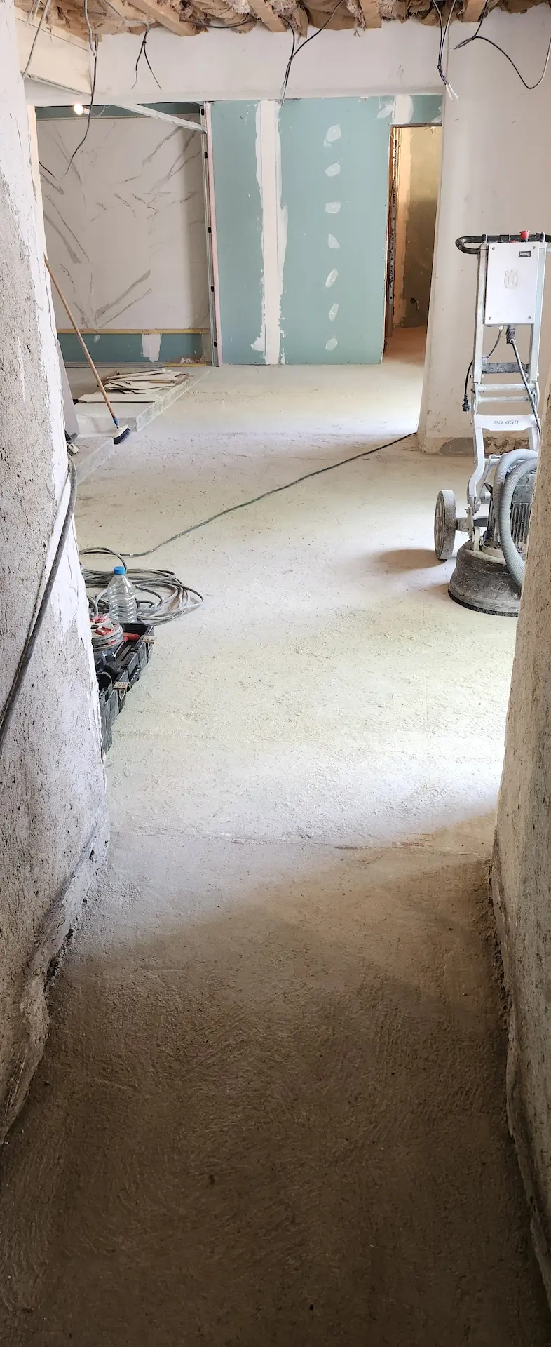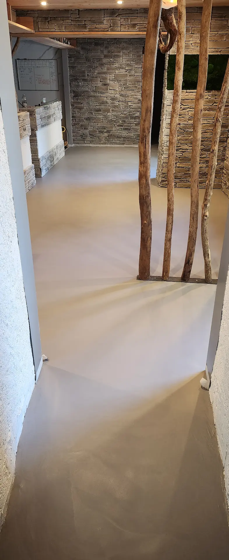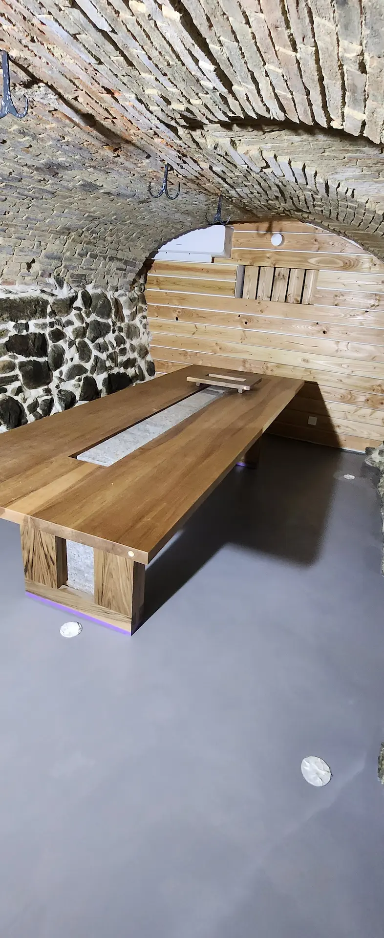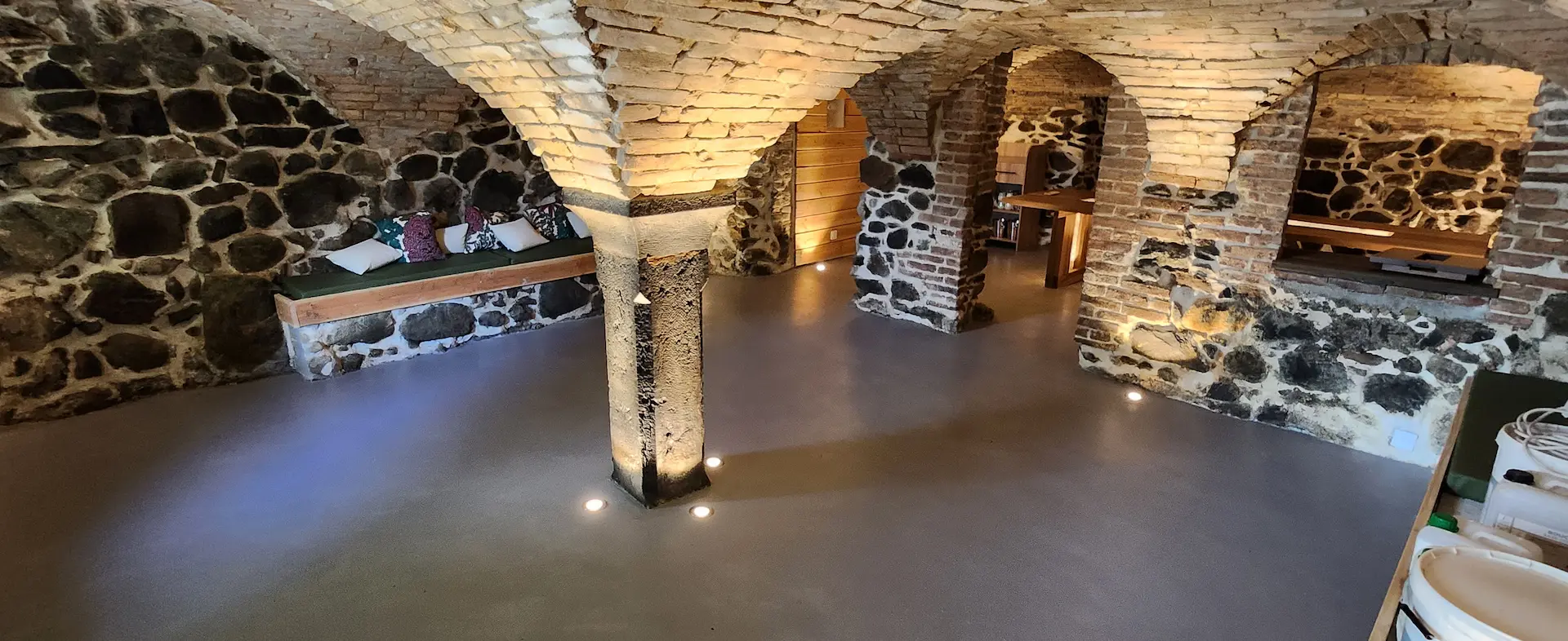 Un sol en béton ciré couleur silex qui sublime les voûtes et murs en pierre, alliant modernité et caractère brut pour un cachet unique.