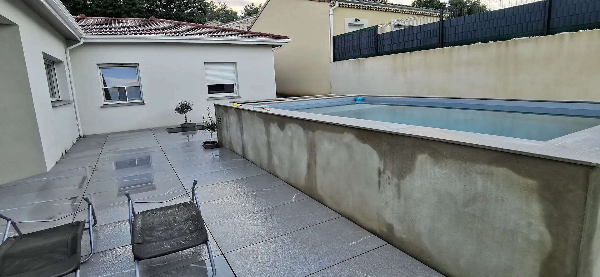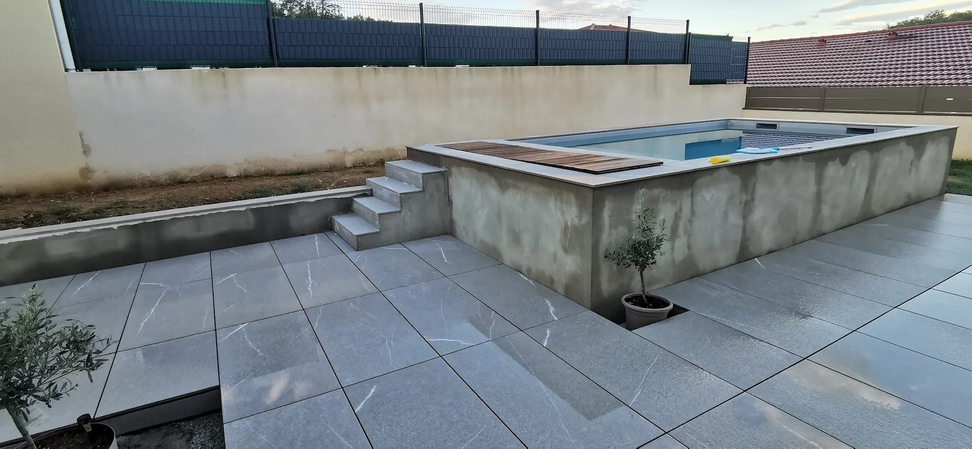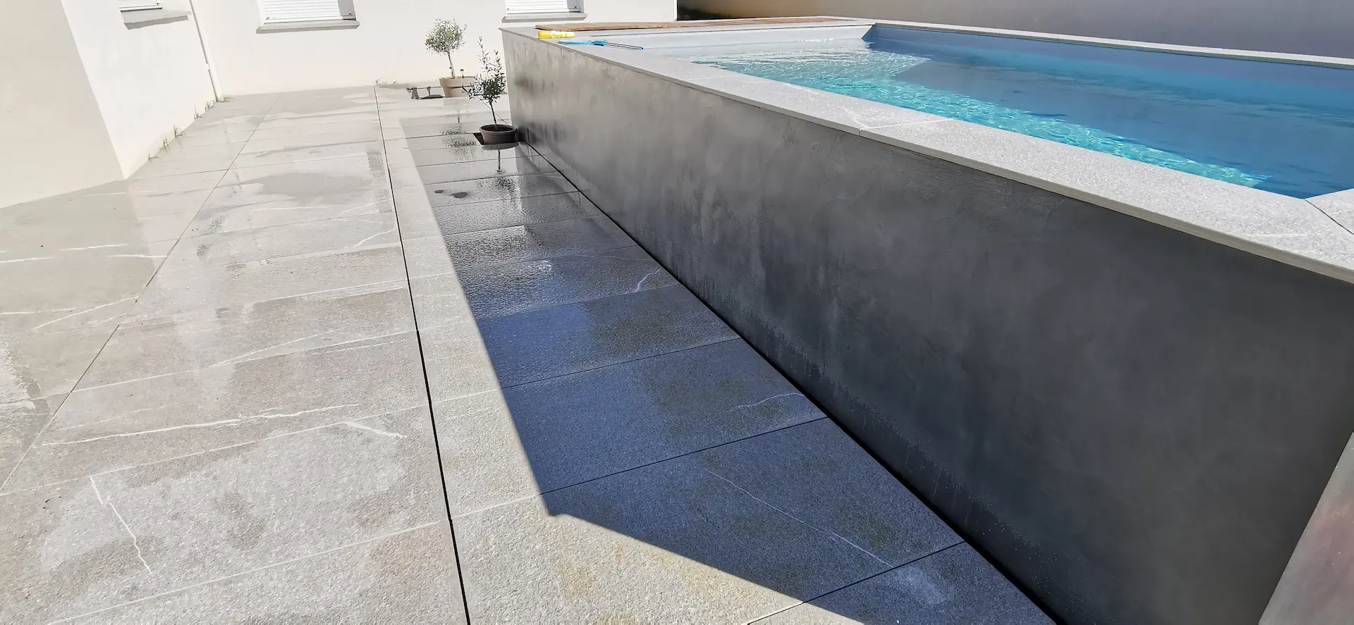 Habillage élégant d’une piscine avec un béton ciré couleur récif, pour un rendu moderne, épuré et parfaitement assorti aux dalles environnantes.