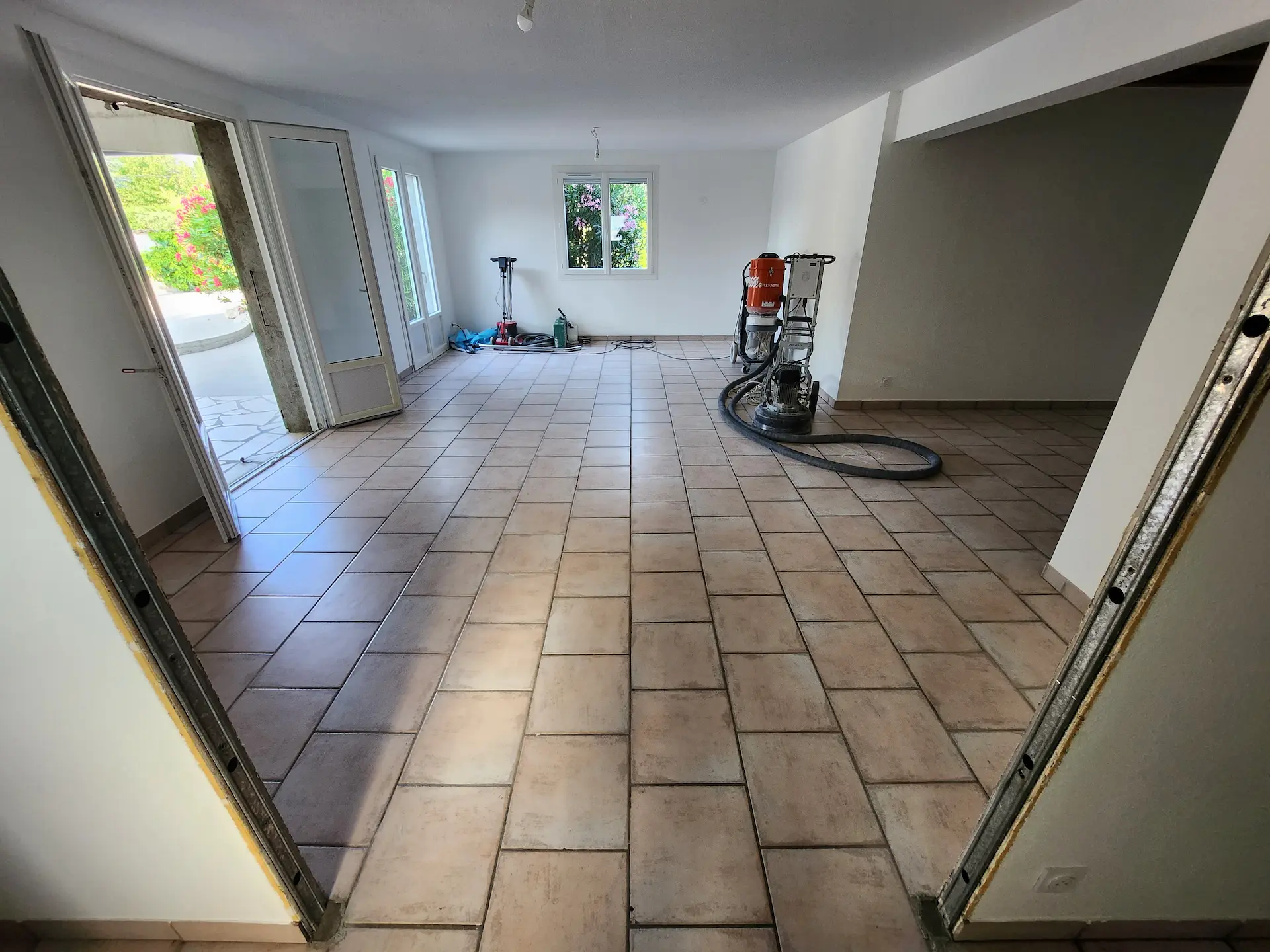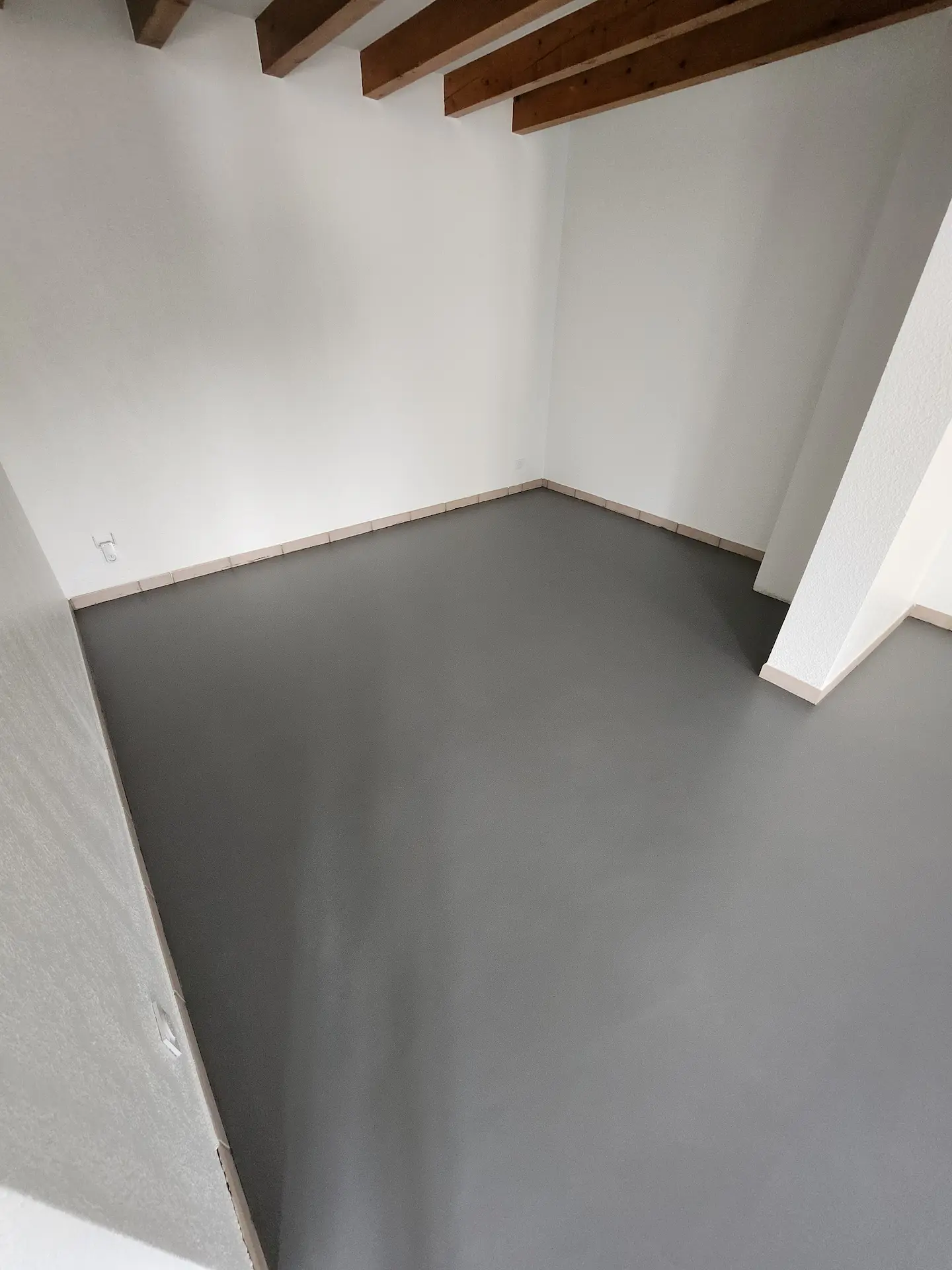 Un sol en béton ciré couleur graphite, apportant un style contemporain et homogène qui valorise les lignes sobres de cet intérieur.