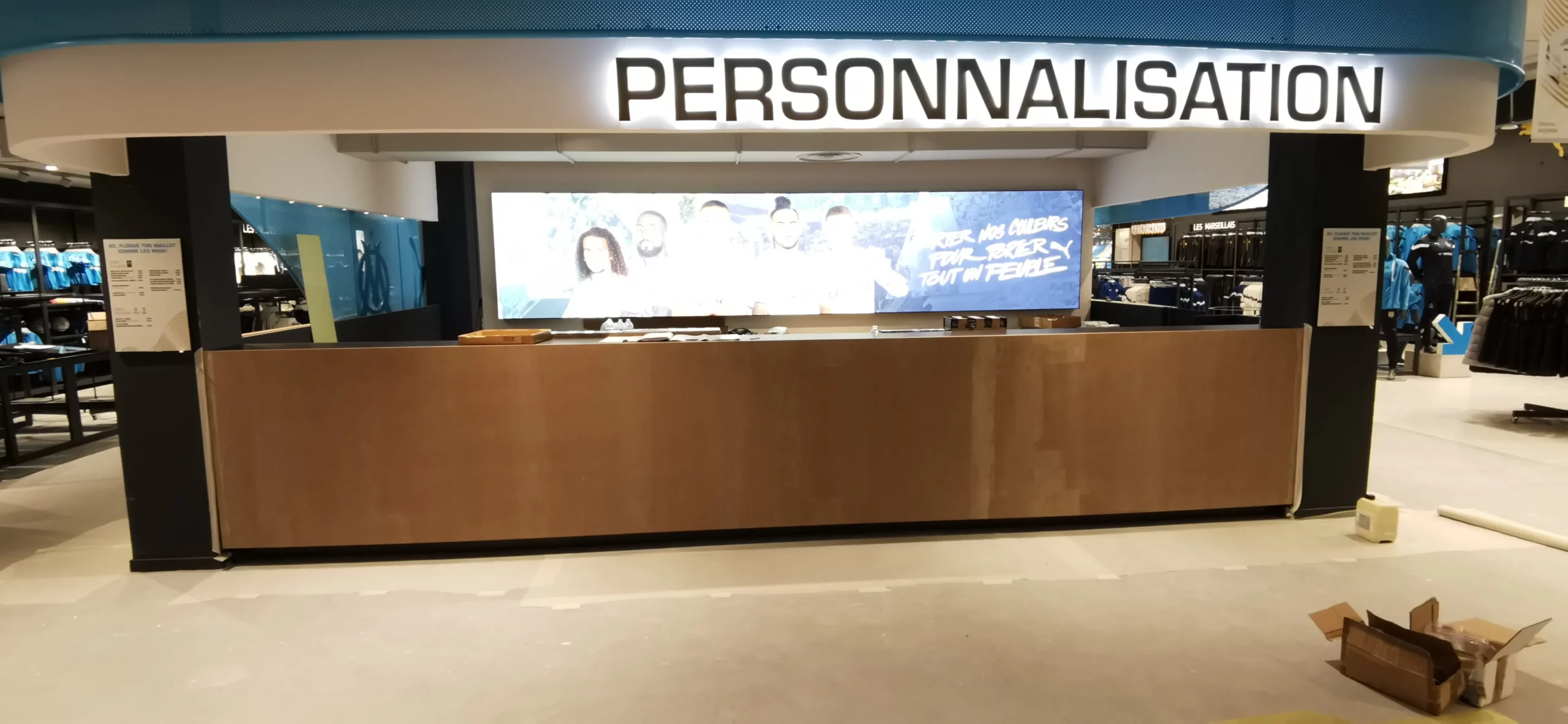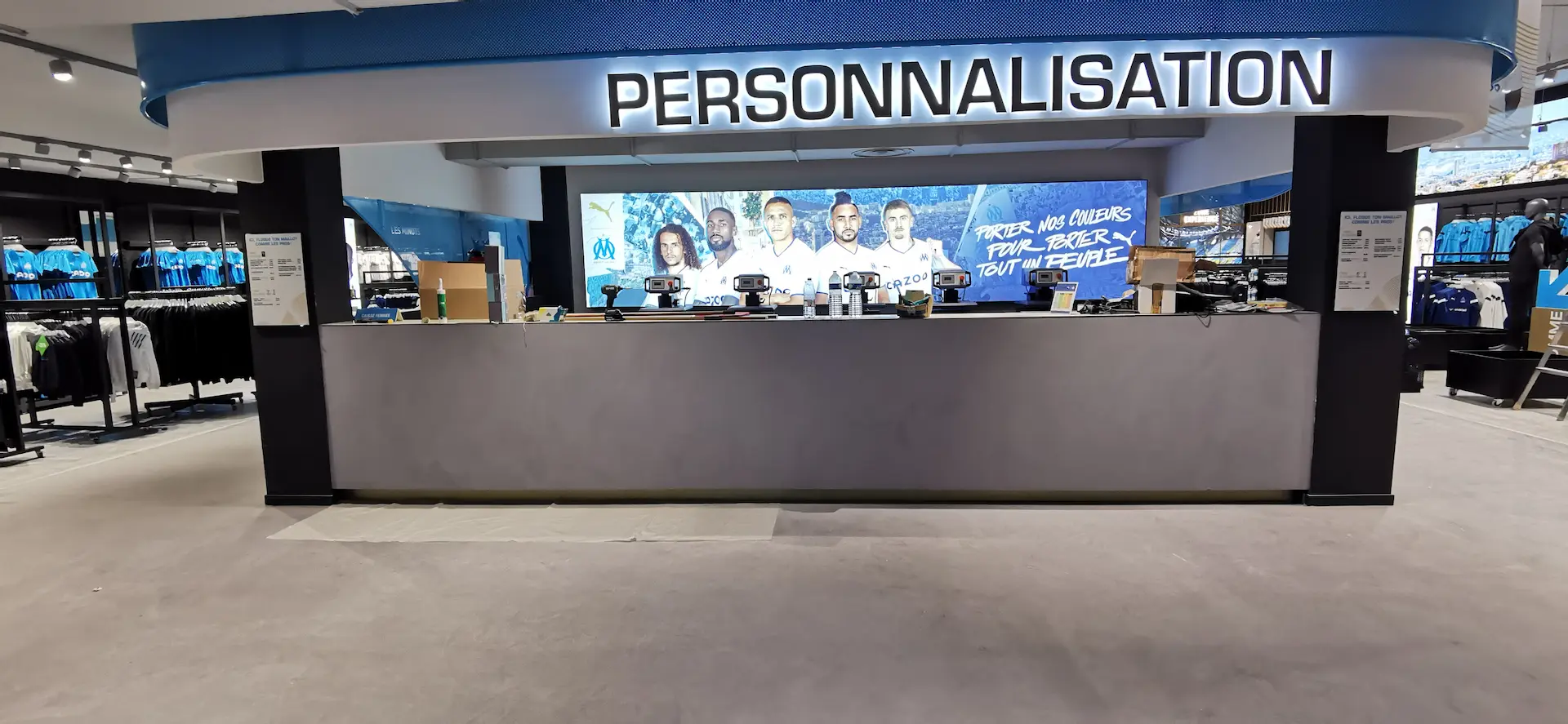 Un sol en béton ciré réalisé au cœur du stade de l’OM, offrant une finition robuste et moderne dans un espace emblématique aux couleurs du club.
