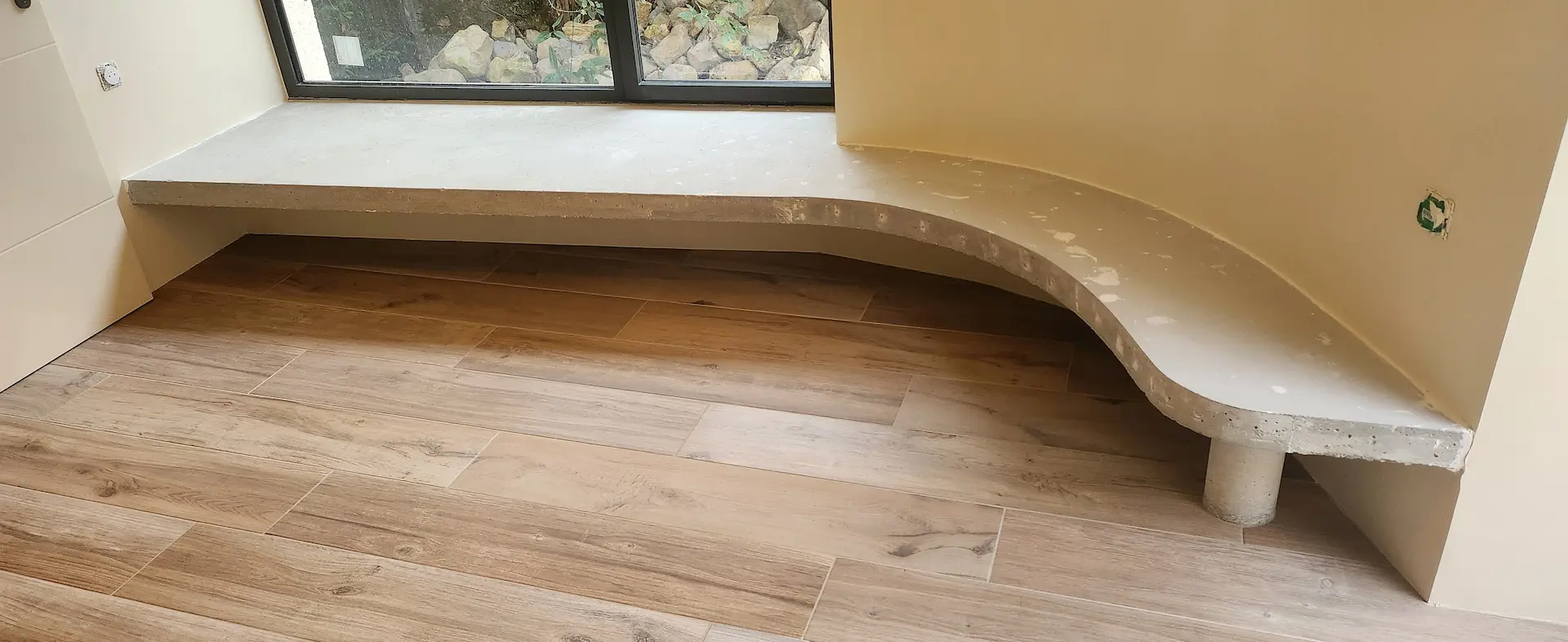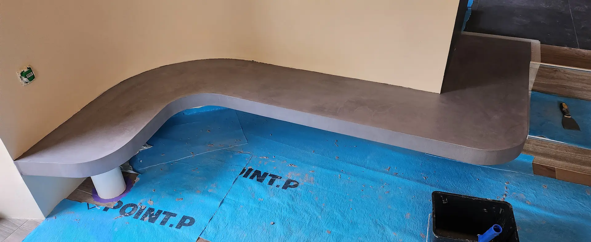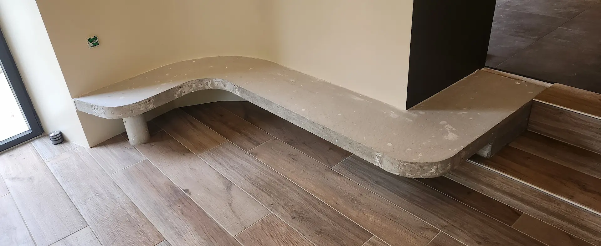 Un banc en béton ciré aux teintes silex et craie, qui associe élégance contemporaine et lignes douces pour sublimer cet espace intérieur.